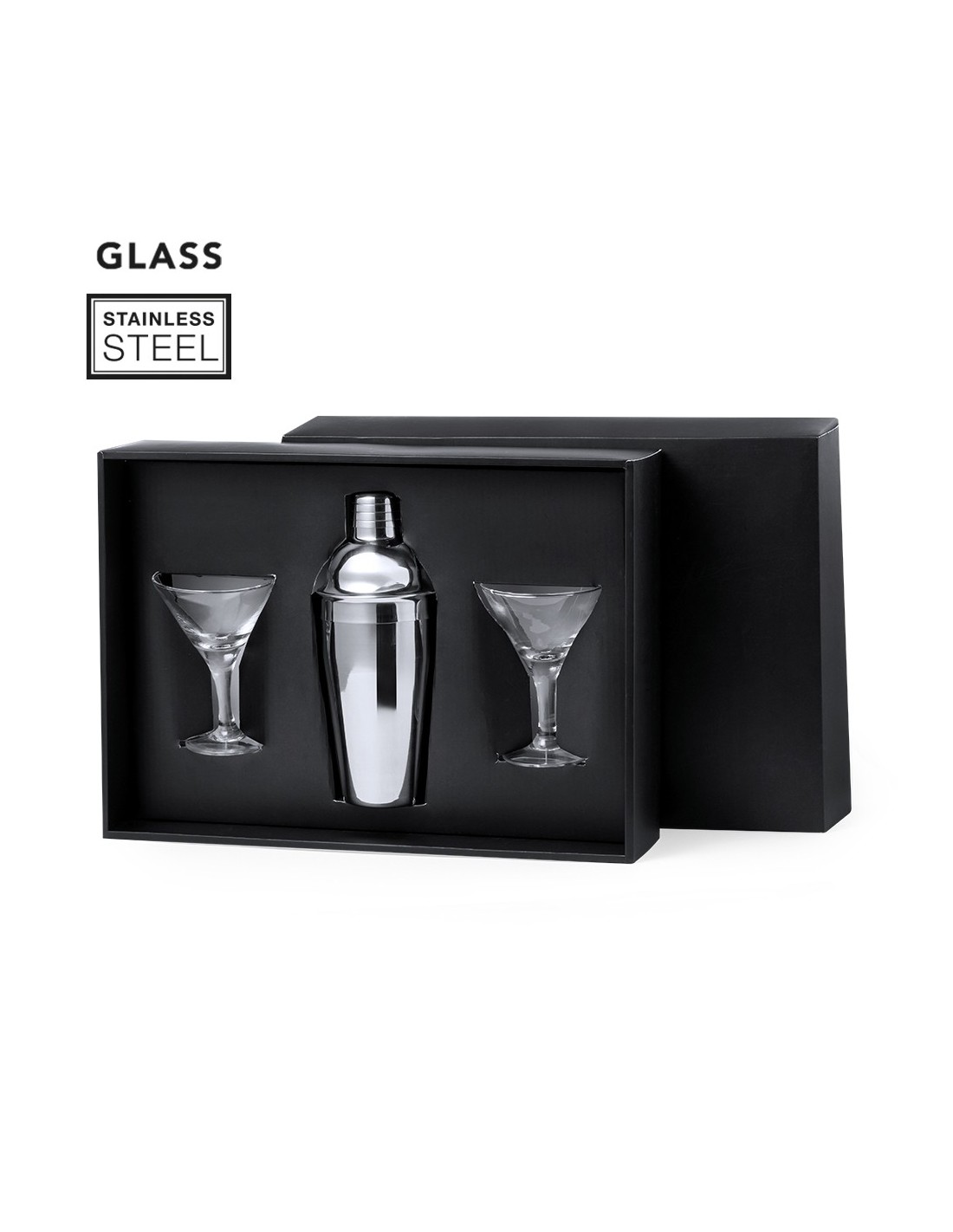 Elegante set de coctel. Conjunto de coctelera en acero inox de 550 ml para preparar las mejores mezclas de bebidas. Además, contiene 2 copas de cristal de 150 ml cada una y de elegante diseño triangular, para una presentación exquisita. Presentado en caja negra.