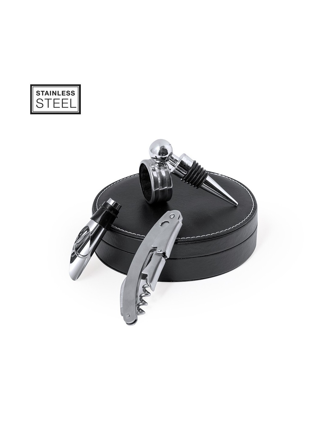 Set de vinos de elegante diseño circular acabado en polipiel, con accesorios de acero inox. Incluye sacacorchos de 2 tiempos con cortacápsulas y abridor; tapón, dosificador y recogegotas. Presentado en estuche individual de polipiel con interior en suave espuma troquelada de color negro.