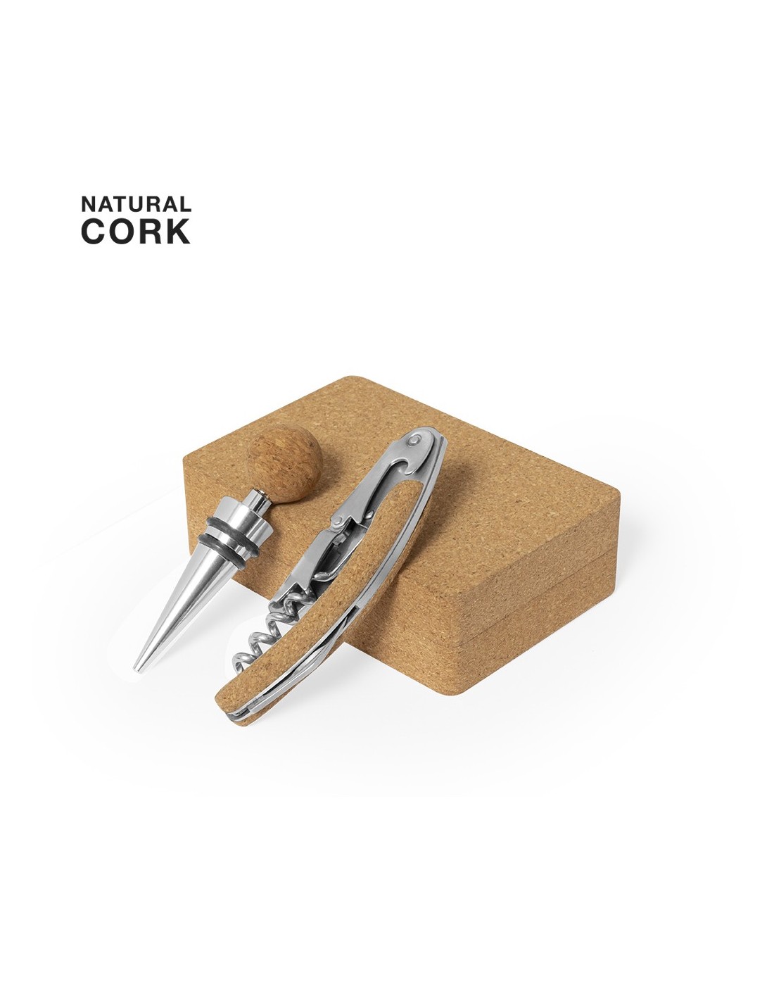 Set de vinos acabado en corcho. Accesorios de acero inox. Incluye sacacorchos de dos tiempos y tapón. Presentado en estuche individual de corcho, con interior troquelado y fijación con imanes..Elaborado con elementos vegetales para así fomentar la utilización de materias primas naturales y reducir las emisiones contaminantes.