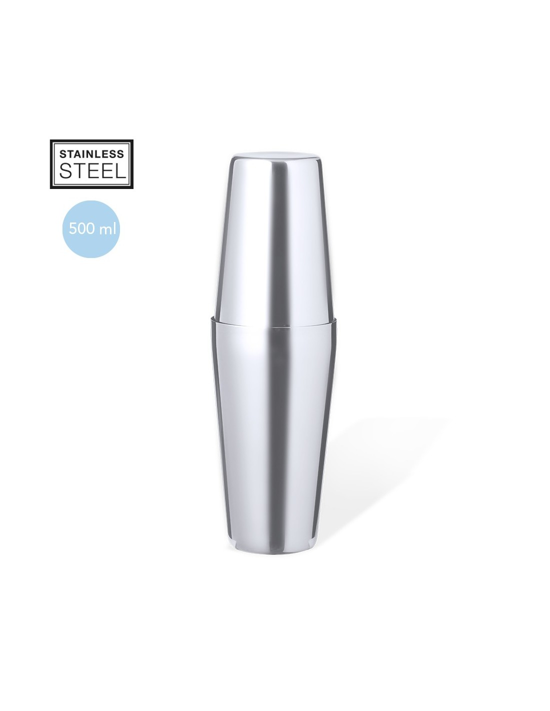 Coctelera de 500 ml fabricada en acero inox. Fabulosa coctelera compuesta de dos vasos en acero inox que encajan entre sí para un perfecto sellado, para preparar bebidas refrescantes. Presentada en caja de diseño kraft.