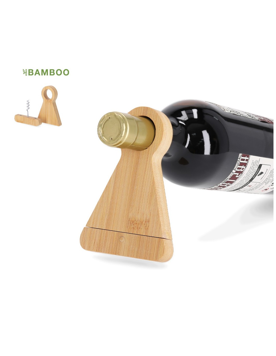 Práctico sacacorchos con función de soporte para botellas fabricado en bambú. Con troquelado redondo para apoyar la botella y sacacorchos extraíble en acero inoxidable fijado con imanes.Materiales como el bambú fomentan la utilización de materias primas naturales reduciendo las emisiones contaminantes. Además, el bambú proviene de una planta de gran resistencia y versatilidad, con crecimiento y regeneración rápida, siendo una excelente alternativa al uso de madera tradicional.