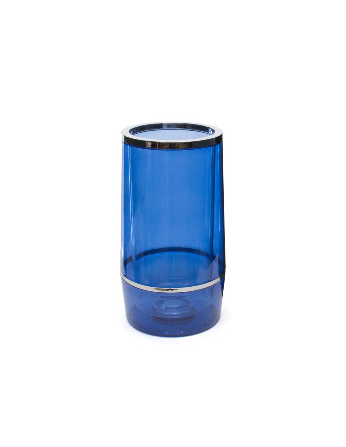 Botellero para botellas de vino de hasta 75 cl en original acabado transparente en variados colores. Con anillas en color plateado brillante y base adaptada para botella. Presentado en caja individual.
